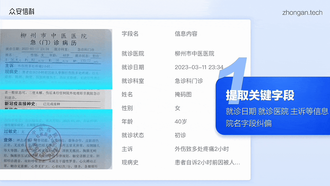 单纯的OCR在面对全国各地千差万别的门诊病历、住院发票时,往往显得力不从心。AI理赔助理的「材料分类与信息提取Agent」支持对异构数据的治理与全流程闭环。它支持通过API对接或页面上传,自动对理赔申请书、门诊/住院病历、发票、费用清单、出院小结、身份证、银行卡等核心影像材料进行识别分类。