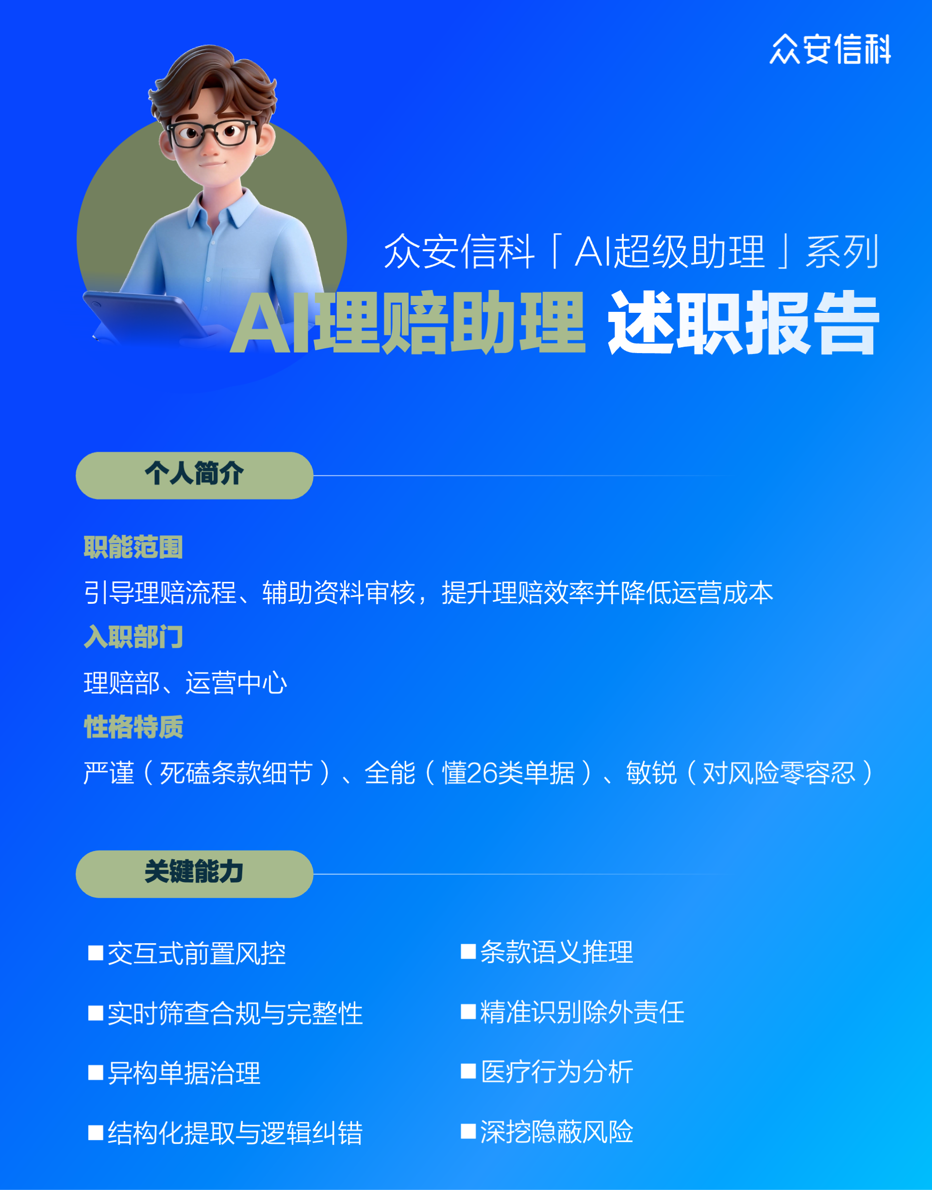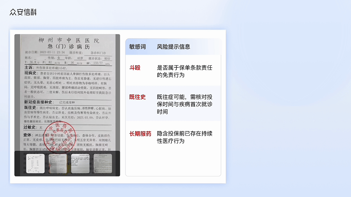 这些“摩擦点”,是众安信科「AI理赔助理」着力破解的核心:理赔业务的AI升级,要求智能产品具备业务自觉,不能只在某个环节搭把手,而是要跑通理赔的全业务流程。