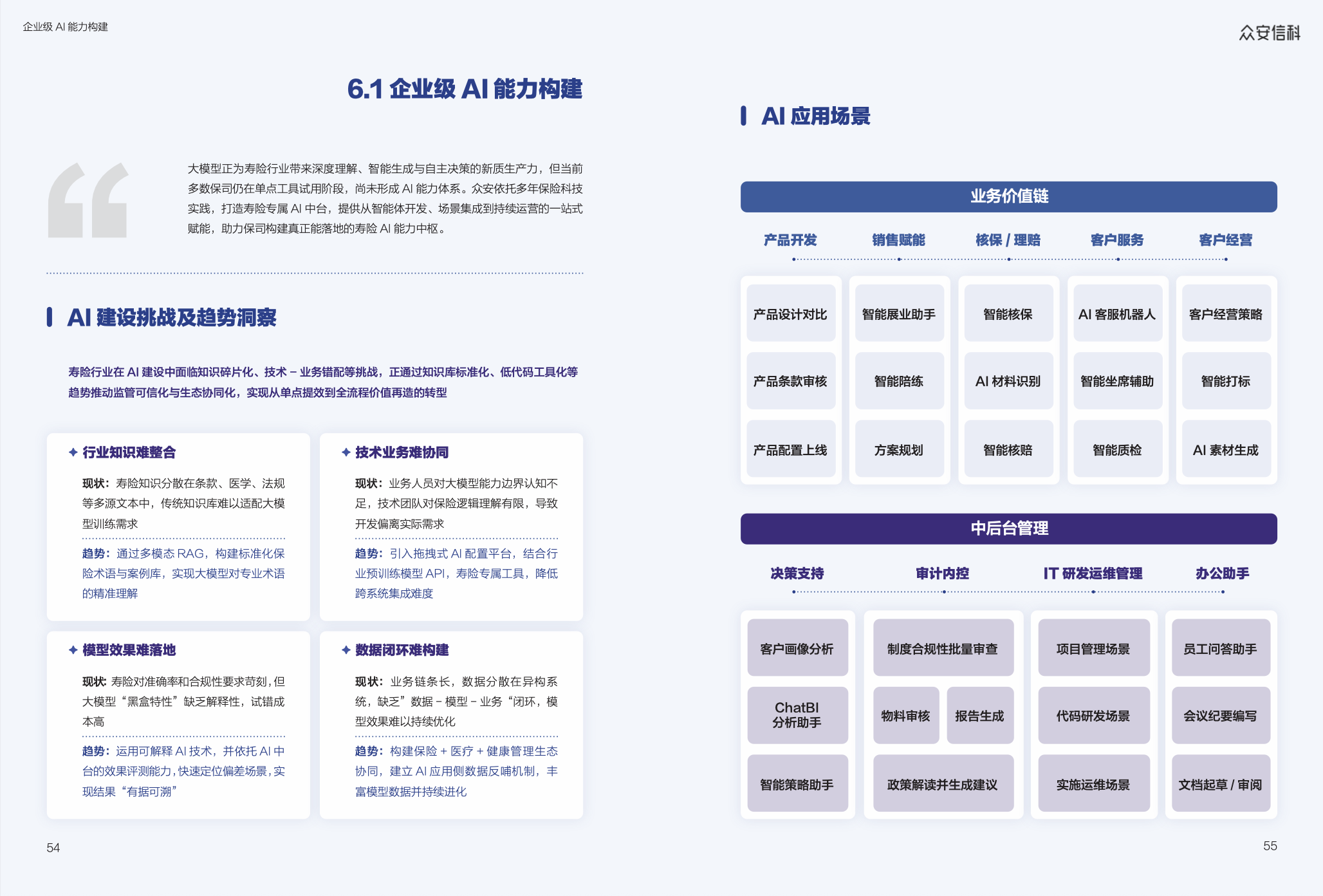 行业深耕的知识体系与智能体平台能力建设:通过多模态RAG,构建标准化保险术语与案例库,实现大模型对专业术语的精准理解;同时通过低代码AI智能体开发平台,降低AI智能体应用构建门槛。助力保司建立可迭代、可解释、全链路的AI能力,实现从产品开发、销售赋能到核保理赔、客户经营的全业务场景智能化落地。