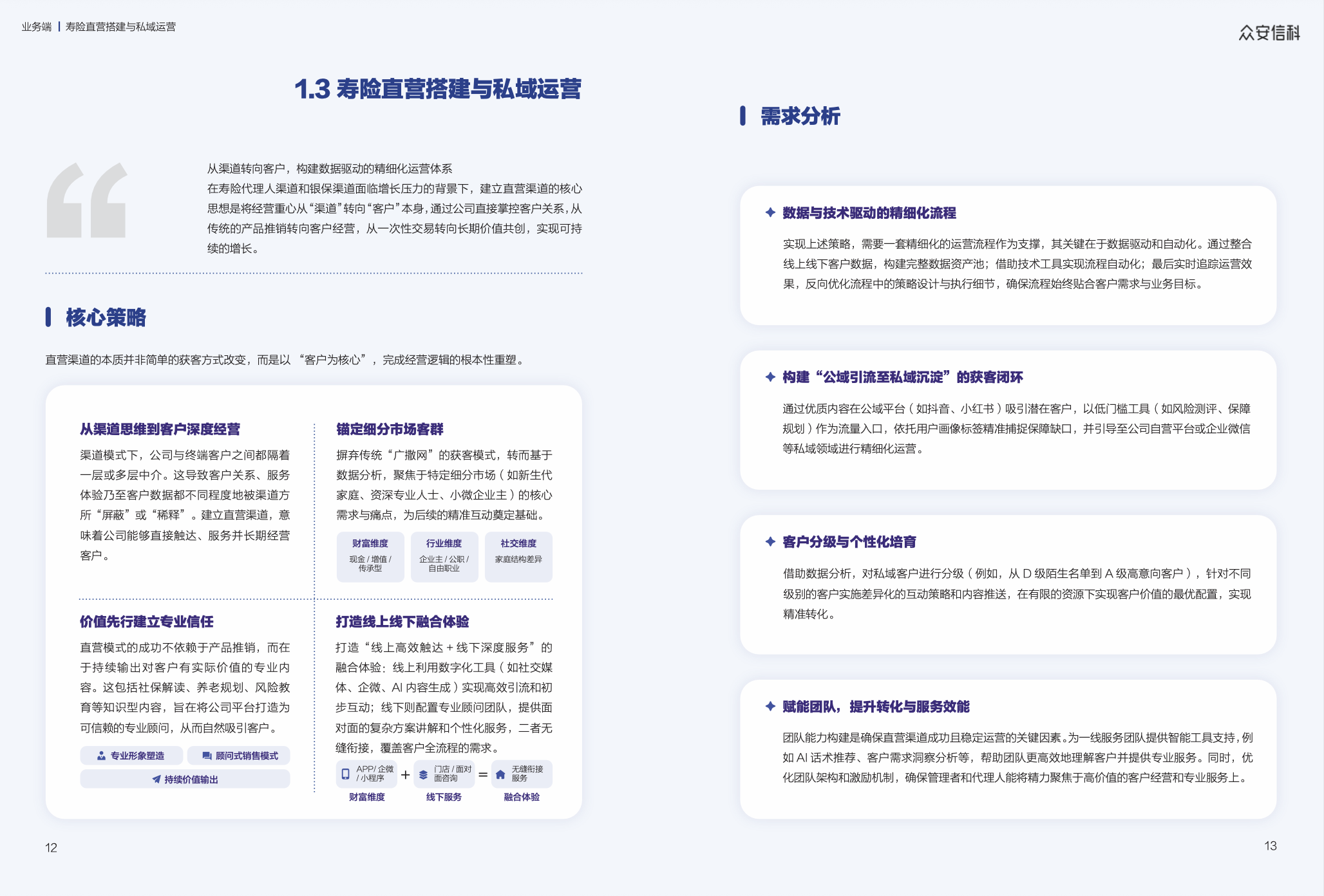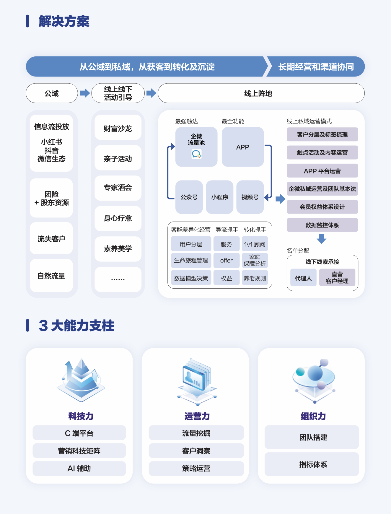 寿险直营搭建与私域运营:通过将经营重心从渠道转向客户,构建以数据驱动、客户为中心的精细化运营体系。以价值内容建立专业信任,聚焦细分客群实现精准互动,并融合“线上高效引流+线下深度服务”的一体化体验,最终完成从产品推销到长期客户经营的逻辑重塑,实现可持续增长。