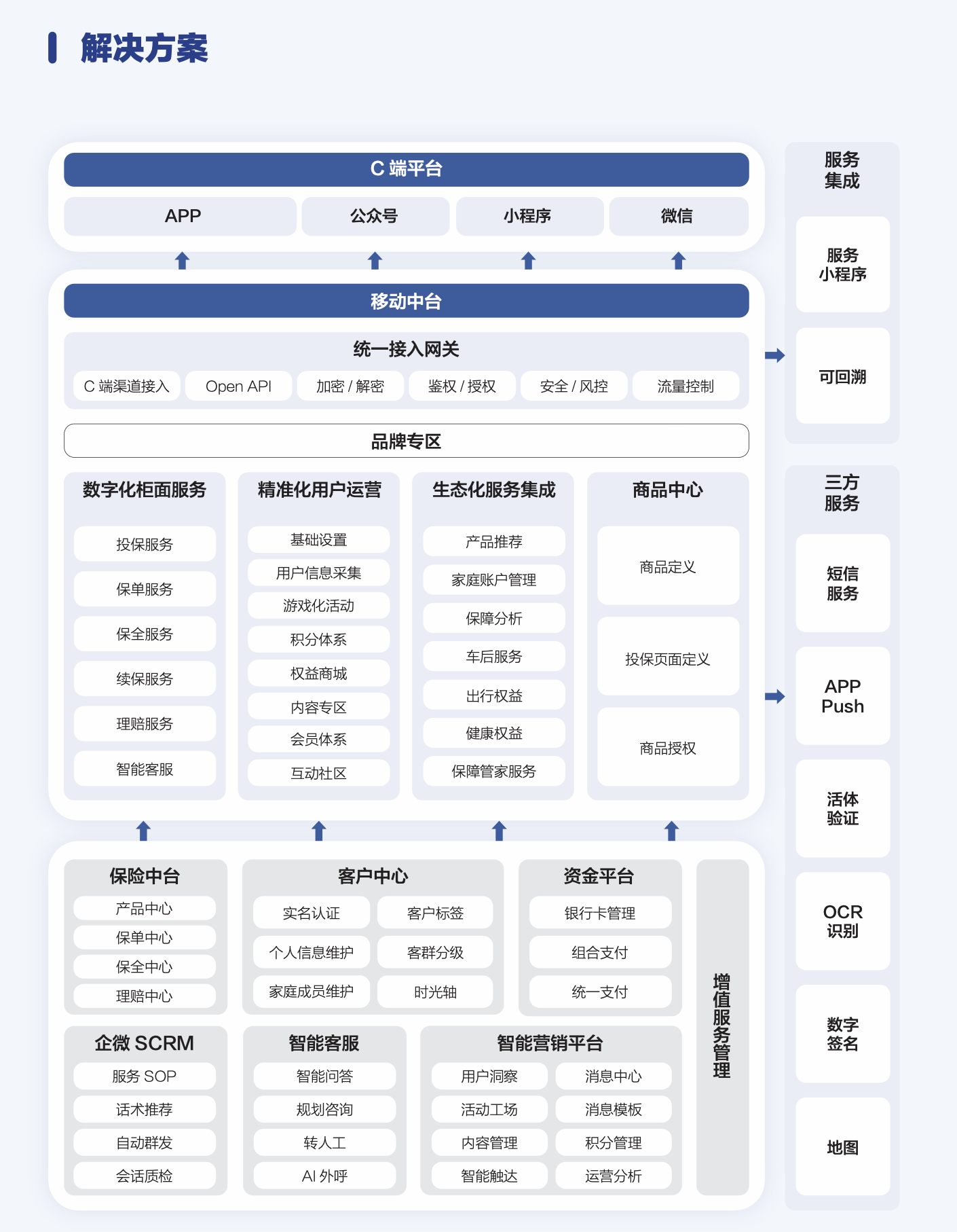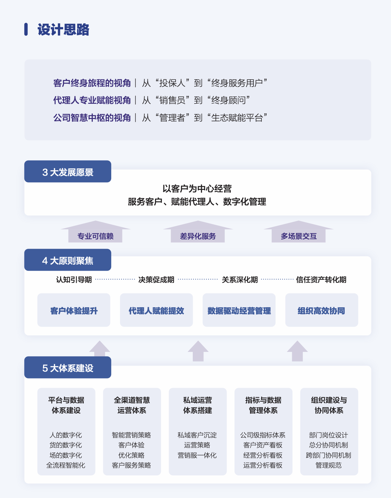 以客户为中心的数字化经营:通过客户数据平台(CDP)、营销自动化平台(MA)、社媒运营平台(SCRM)等工具,在客户全生命周期关键节点提供个性化互动与综合场景解决方案,实现从“投保人”到“终身服务用户”的价值深化,最终完成数据驱动的主动式客户经营与生态闭环构建。
