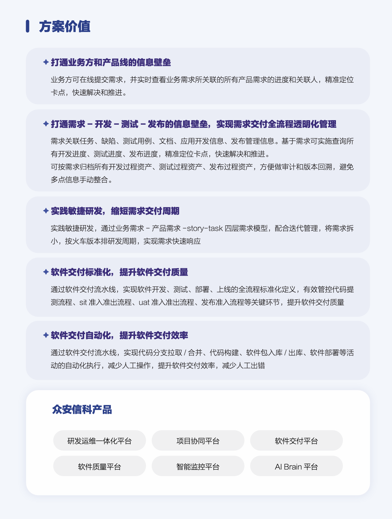 研发效能提升与精益交付:通过DevOps一体化研发运维平台,打通需求、开发、测试、发布的全链路信息壁垒,实现软件交付流程的标准化、自动化与可视化;并结合敏捷实践与工具链整合,显著提升跨团队协同效率与系统稳定性,从而支撑业务快速迭代与高质量交付,保障数字化转型平稳落地与持续进化。
